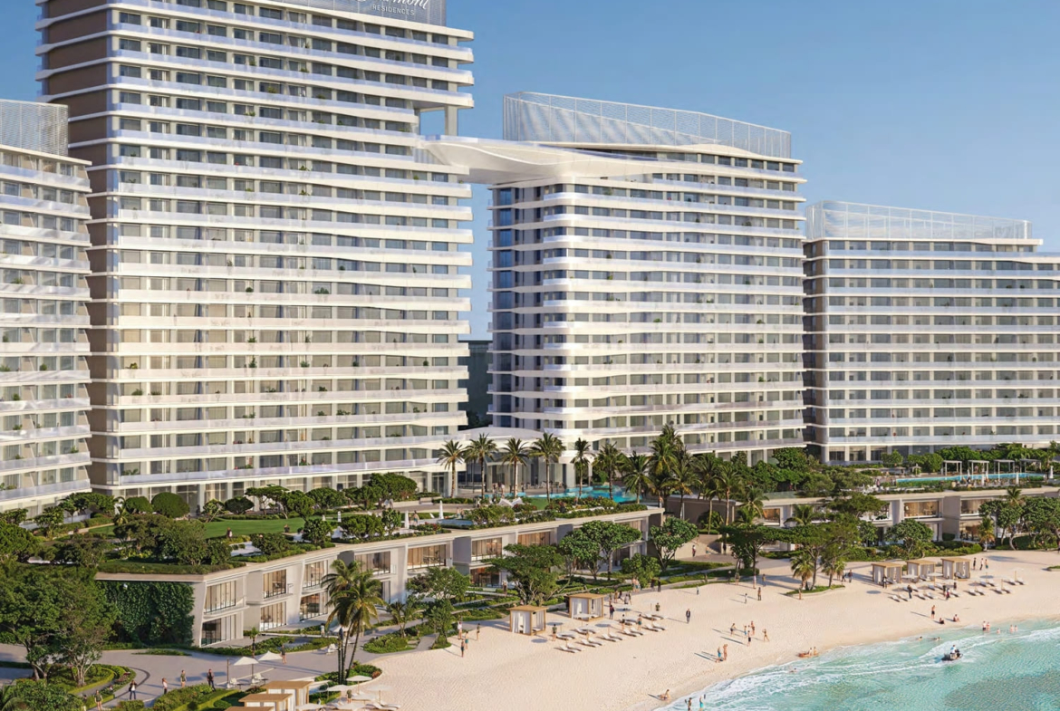 The project boasts an exceptional suite of amenities tailored to enrich daily living and create an environment of pure comfort and convenience. Residents enjoy direct beach access, multiple swimming pools including a sky pool, a state-of-the-art fitness center, wellness facilities, a screening room, and a kids’ club. Additional luxuries include private dining rooms, a games room, water sports facilities, a dog wash station, and elegant gardens, all complemented by access to the Fairmont Resort.