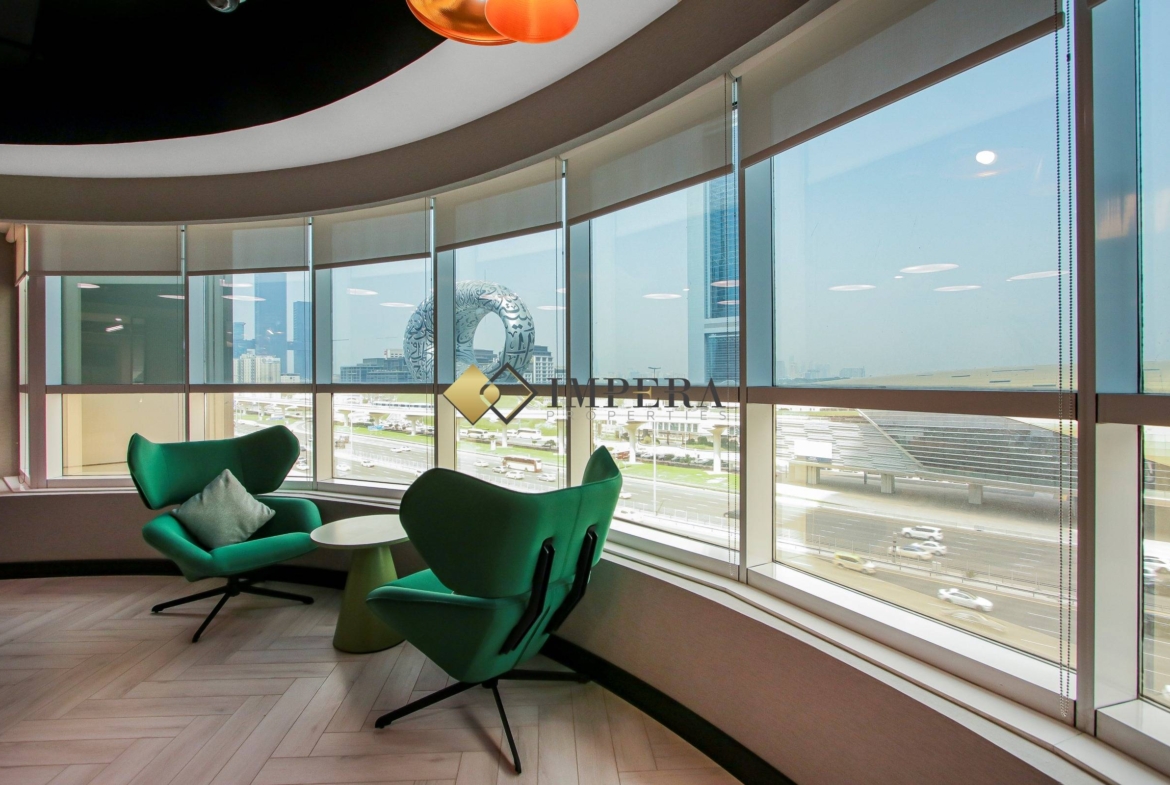 Step into a premium 290 sq. ft. private office in a landmark 32-story tower, right on Sheikh Zayed Road and just steps from Emirates Metro Station. Enjoy breathtaking views of the Museum of the Future while working in a space designed for productivity and comfort.