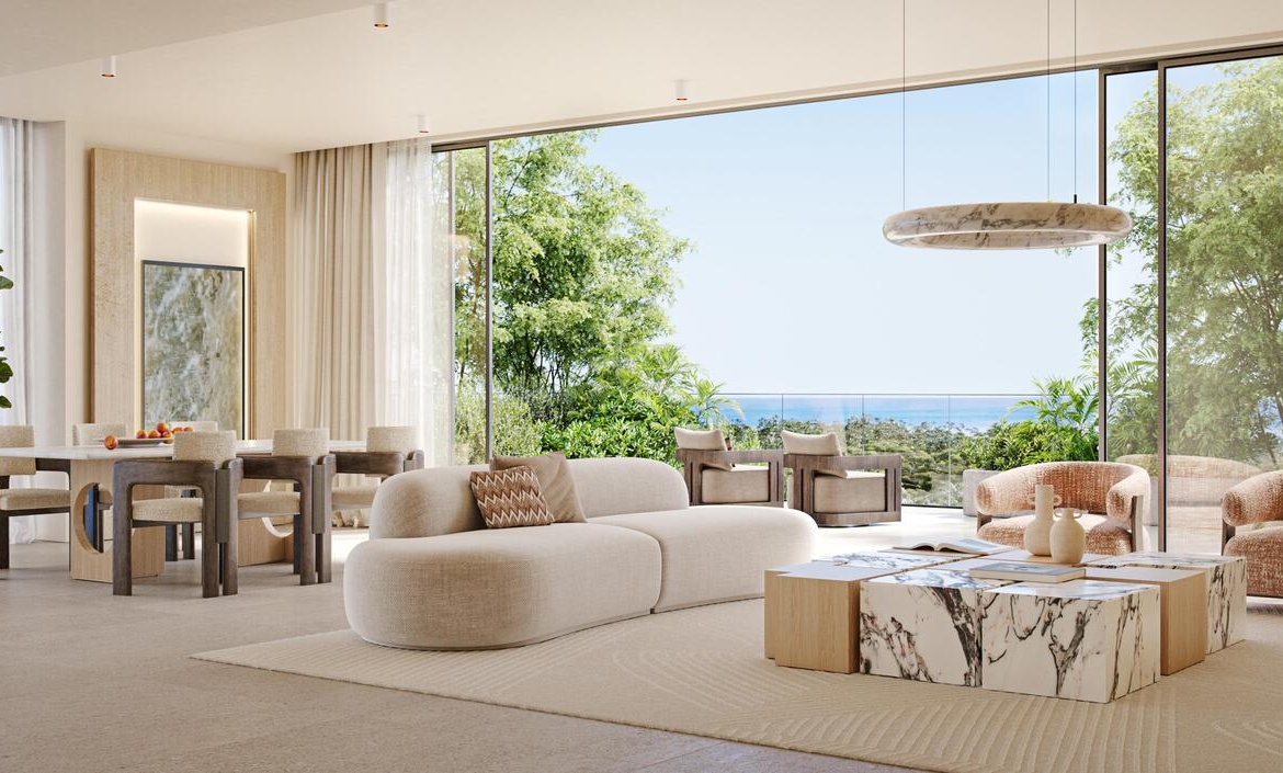 Residences at Talea include 1- to 4-bedroom apartments and double-height penthouses, all designed to bring nature indoors. Floor-to-ceiling windows invite sea breezes and natural light, while interiors feature stone finishes, soft tones, natural textures, and bespoke cabinetry. Kitchens and bathrooms are crafted with luxury and calm in mind, creating a sensory experience that merges refined comfort with effortless functionality. Private garden terraces and panoramic views of the sea, skyline, and forest further elevate the sense of place.